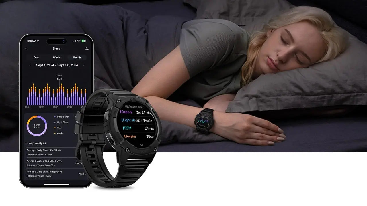 KOSPET TANK S2 keeps tabs on your sleep, whether it is a nap or nightly sleep. The smartwatch records your condition at different sleep stages, such as deep sleep, light sleep, and REM sleep. Schedule your bedtime and set sleep goals to improve your sleep habits and quality.