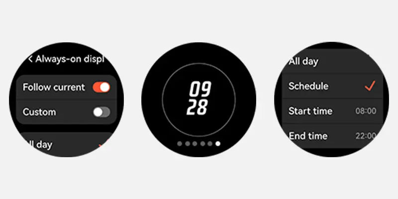 Schedule and customize an AOD watch face, or set it to follow the current watch face.