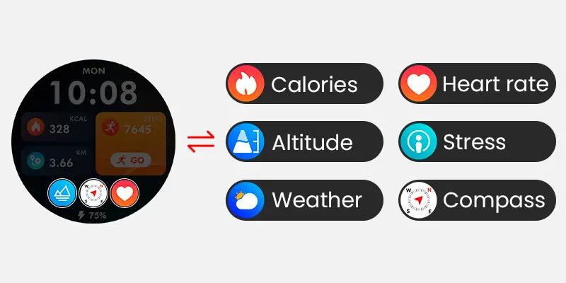 Choose from different data metrics to display what matter most — date, air pressure, steps, and beyond.