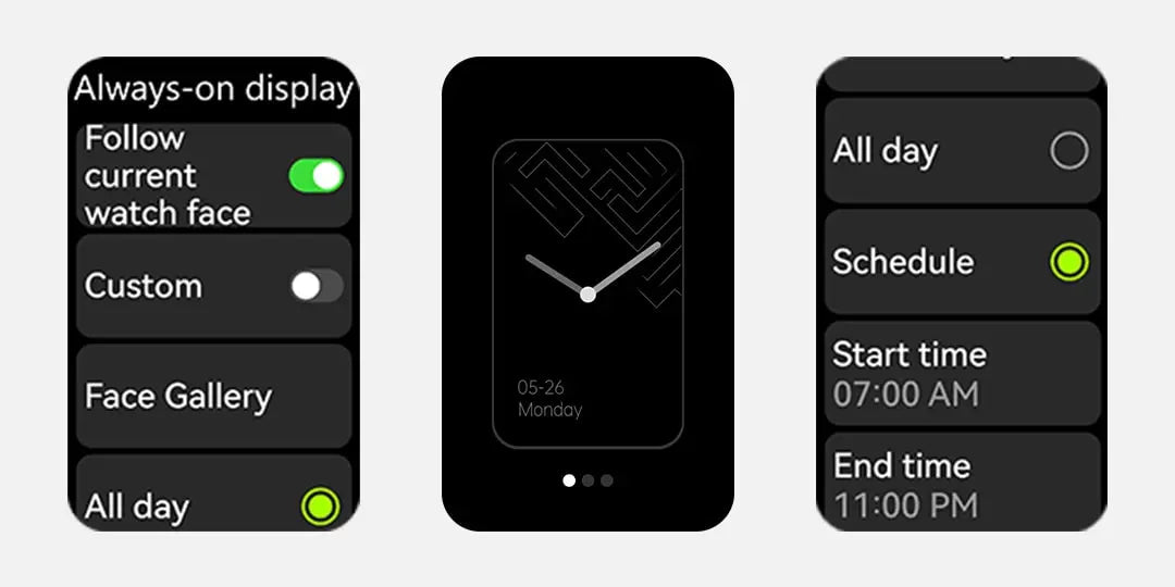 Customize and schedule always-on display. Set it to follow the current watch face or create with a unique theme.