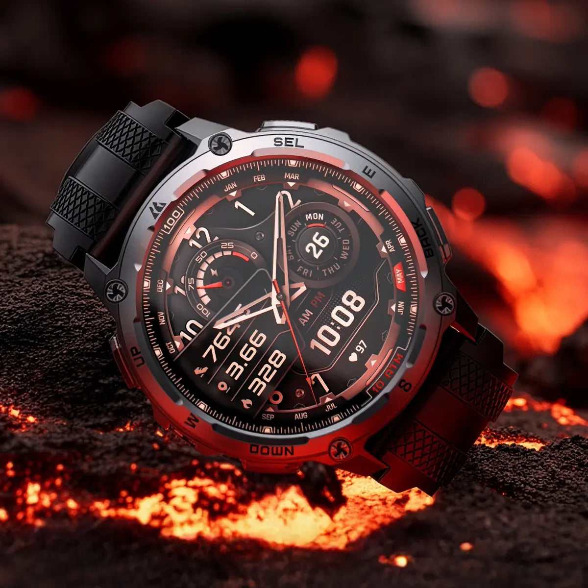 Battle -50℃ extreme cold, outlast 70℃ blazing heat, endure humidity, shock, and more — KOSPET TANK M4 is a tactical smartwatch, tested by SGS, an independent European lab, against 20 U.S. MIL-STD-810H standards, ready for your most rugged adventures. An integrated ambient light sensor ensures its 1.96-inch AMOLED display remains clear from dawn to dusk.